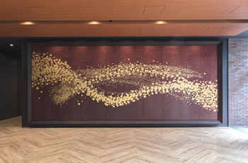 1階 和紙アート 国際医療福祉大学の理念「共に生きる社会」をヒントに「様々な要素が集まってかたちになる」をテーマにデザインしています。 |