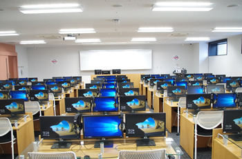 4階 CALL教室 語学教育システムが組み込まれたパソコンは教卓とつながっており、音声や映像、テキストなどを配布し効率的に語学学習を行うことができます。 |
