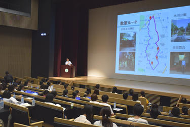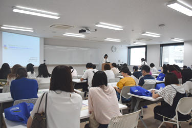 この日の東京都内は最高気温35度という猛暑でしたが、受付開始の9時30分すぎから高校生のグループや親子連れが続々と訪れ、学生スタッフの案内で受付票を記入。10時開始のガイダンスには約90人が参加し、心理学科、医療マネジメント学科の両学科長が学修内容などを説明した後、事務担当者が入試の概要を解説しました。