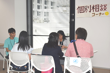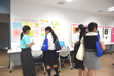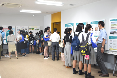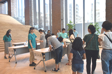 両学科のフロア(5階、6階、8階)では、学生の企画を中心にさまざまなイベントを用意しました。メイン会場の教室では、サークル活動の模様や赤坂近辺の名所、お薦めの飲食店などについて、学生たちが自主制作したパネルを使って説明するコーナーに行列ができました。また、学生スタッフが、来場した中学・高校生や保護者らとお茶やジュースを飲みながら交流する「カフェ・ド・赤坂」も盛況で、授業内容やキャンパスライフなどの話題で盛り上がりました。