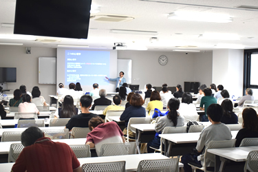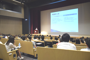この日の東京都内は最高気温が30度を下回り、比較的過ごしやすい1日になりました。来場者の出足も早く、10時開始のガイダンスにはこれまでで最多の108人が参加。心理学科、医療マネジメント学科の学科長が指導方針や将来の進路などを説明した後、担当者が入試概要を説明しました。