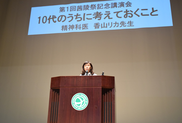 第1回茜陵祭記念講演会では精神科医の香山リカさんが「10代のうちに考えておくこと」を解説。謝罪マスター/作家の竹中功さんは特別講演会で「吉本興業で学んだ『笑い』と謝罪の極意」と題し「『普通』『誰でも』『みんな』という言葉は謝罪するときには禁句だ」などとコミュニケーションで気配りする点を紹介しました。