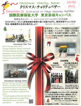 国際医療福祉大学 東京赤坂キャンパスでは、来たる12月21日(金)、茜陵祭でバザーを実施したSI(ソーシャル・イノベーション)クラブと国際交流センターの共催で、チャリティバザーを開催いたします。