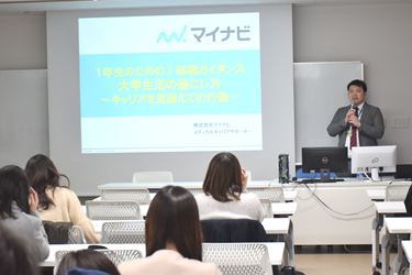 当日は、株式会社マイナビから講師を招いて、「1年生のための就職ガイダンス 大学生活の過ごし方~キャリアを見据えての行動~」と題し、1)学生生活で大切なこと、2)就職活動のスケジュールについて、3)今からやること!のテーマごとに就職活動の現状説明と自己分析のシミュレーションを交えて講演していただきました。