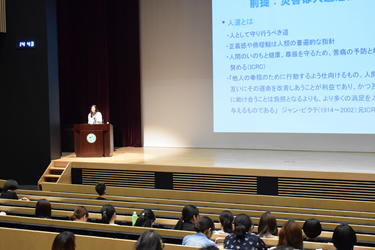 講演で石井教授は、「災害は人道危機だ」との前提に立ち、人道支援について「緊急事態またはその直後における、人命救助、苦痛の軽減、人間の尊厳の維持及び保護のための支援」であると定義しました。