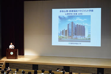 オープンキャンパス最初のプログラムは午前10時からの「総合ガイダンス」。東京赤坂キャンパスの心理学科と医療マネジメント学科の学びの特長、取得可能な資格、卒業後の進路などについて、両学科長が熱く、そして丁寧に説明しました。続く入試説明では、今年度の入試制度や概要を詳しく解説しました。
