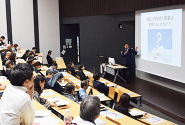 講演の中には、自分自身の睡眠について質問に回答しながら自己分析をする時間もあり、参加した皆さんは終始興味深そうに、中田教授の話に聞き入っていました。