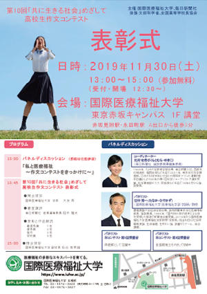 本学の建学の精神「共に生きる社会の実現をめざして」を基調として毎年開催されている高校生作文コンテストは、今年で10年目を迎えました。この第10回を記念して、パネルディスカッション「私と医療福祉~作文コンテストをきっかけに~」を開催いたします。