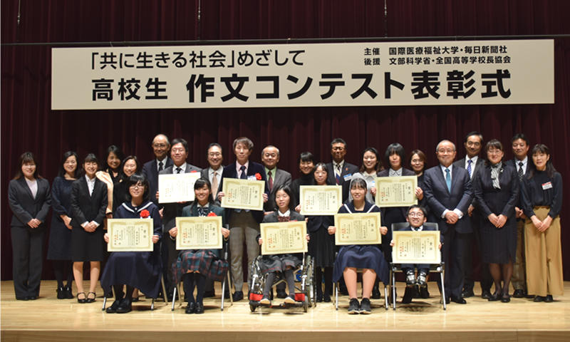 第10回「共に生きる社会」めざして 高校生作文コンテスト(主催・国際医療福祉大学、毎日新聞社、後援・文部科学省、全国高等学校長協会)の表彰式が11月30日、東京赤坂キャンパスで開かれました。「医療と福祉、わたしの体験」「未来のための今を生きる」「多様性を認め合う社会をめざして」の3つのテーマに全国から過去最多の2,640点の作品が寄せられました。