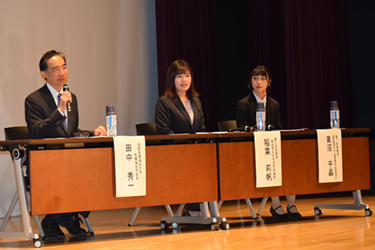 ![]() パネラーのみなさん。左から国際医療福祉大学 田中秀一医療福祉学部長、第5回佳作受賞者稲葉莉帆さん、同大保健医療学部言語聴覚学科3年、第7回優秀賞受賞者高沼千晶さん |