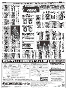 最優秀賞を受賞した山本彩佳さん(東京都・桜美林高等学校1年)の作品『ありのままの自分で』全文の他、大友邦学長による講評、パネルディスカッション『私と医療福祉~作文コンテストをきっかけに~』のサマリーが掲載されました。(12月14日毎日新聞朝刊)