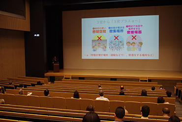 講演では、風邪やインフルエンザとの違いといった根本的なところから新型コロナについて説明され、感染者の特徴や現在拡大しているウイルスはどこから由来したのか等、対策に繋がる踏み込んだ内容へと進みました。感染経路に関しては、3密やクラスターを避けることはもちろん、様々な場所でのリスクを考え「新しい生活様式」を実践していくことが大事であるとのことでした。ただし、いわゆる「マスク警察」や、感染者を責めるようなことはやめてほしい等、新しい生活様式に追加してほしいことについても指摘がありました。自分を守る、相手を守る、思いやりのある生活が目標です。