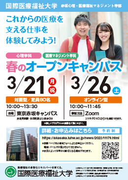 3月21日は実際にキャンパスで体験していただける「対面型」、3月26日はどこからでも参加できる「オンライン型」での開催を予定しています。ぜひ、春休み中に国際医療福祉大学 東京赤坂キャンパスをチェックしてください!