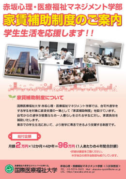 国際医療福祉大学 赤坂心理・医療福祉マネジメント学部では、 自宅外通学をする学生を対象に経済支援の一環として「家賃補助制度」を設けています。 自宅通学が困難なため下宿を余儀なくされる学生に対し、家賃負担を補助いたします。 東京での学生生活において、より勉学に専念できるよう支援する制度です。 ぜひ、志望校選択のご参考になさってください。 家賃補助制度について詳しくはこちら
