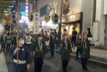 16日に行われた宵宮巡行では、本学・東京赤坂キャンパスの学生サークル「赤坂同好会」のメンバーが、祭装束で赤坂氷川山車「翁二人立」の巡行隊列に加わりました。