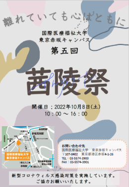 国際医療福祉大学 東京赤坂キャンパスは、旧赤坂小学校の跡地に開設されています。赤坂小学校の旧称が「第3中学校区第3番小学校茜陵学校」だったことにちなみ、大学祭の名称を「茜陵祭」としました。赤坂一帯にはかつて、茜(あかね)の花が群生していたそうで、赤坂小学校の校章にもその花弁があしらわれています。