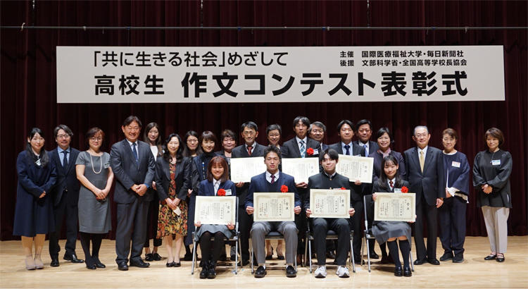 第11回「共に生きる社会」めざして 高校生作文コンテスト」(主催・国際医療福祉大学、毎日新聞社、後援・文部科学省、全国高等学校校長協会)の表彰式が12月10日(土)、東京赤坂キャンパス講堂で開かれました。厳正な審査の結果、最優秀賞に宮崎県立宮崎西高等学校3年の大仁田健さんの「私は門前の小僧である」が選ばれ、審査委員長の三浦総一郎・国際医療福祉大学大学院長から表彰状や楯などが贈られました。