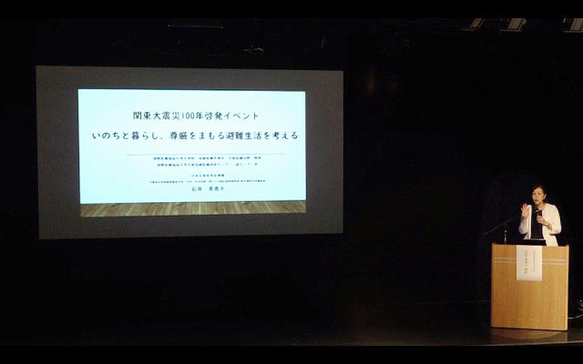 関東大震災10年を受け、港区が震災の教訓を継承していこうと企画したイベントが9月2日(土)にみなとパーク芝浦(港区芝浦1-16-1)で行われ、本学の石井美恵子教授が「いのちと暮らし、尊厳を守る避難生活を考える」と題して講演を行いました。