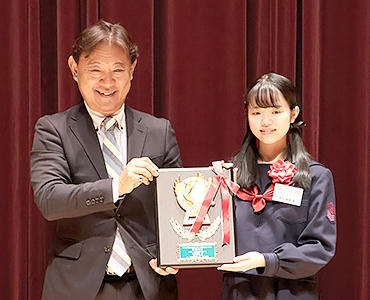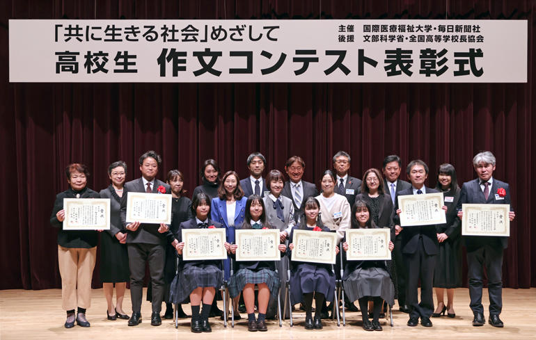 優秀賞には、広島県・盈進高等学校2年の川原愛梨さんの「そのぬくもり感じて」が、佳作には栃木県・佐野日本大学高等学校3年の川島里菜さんの「あなたと共に生きるということ」と、福岡県・北九州市立高等学校2年の藤﨑詩麻さんの「病気が導いてくれたもの」が選ばれ、審査委員長の鈴木康裕・国際医療福祉大学学長から表彰状や楯などが贈られました。個人賞では、このほかに入選4人が選出されています。
