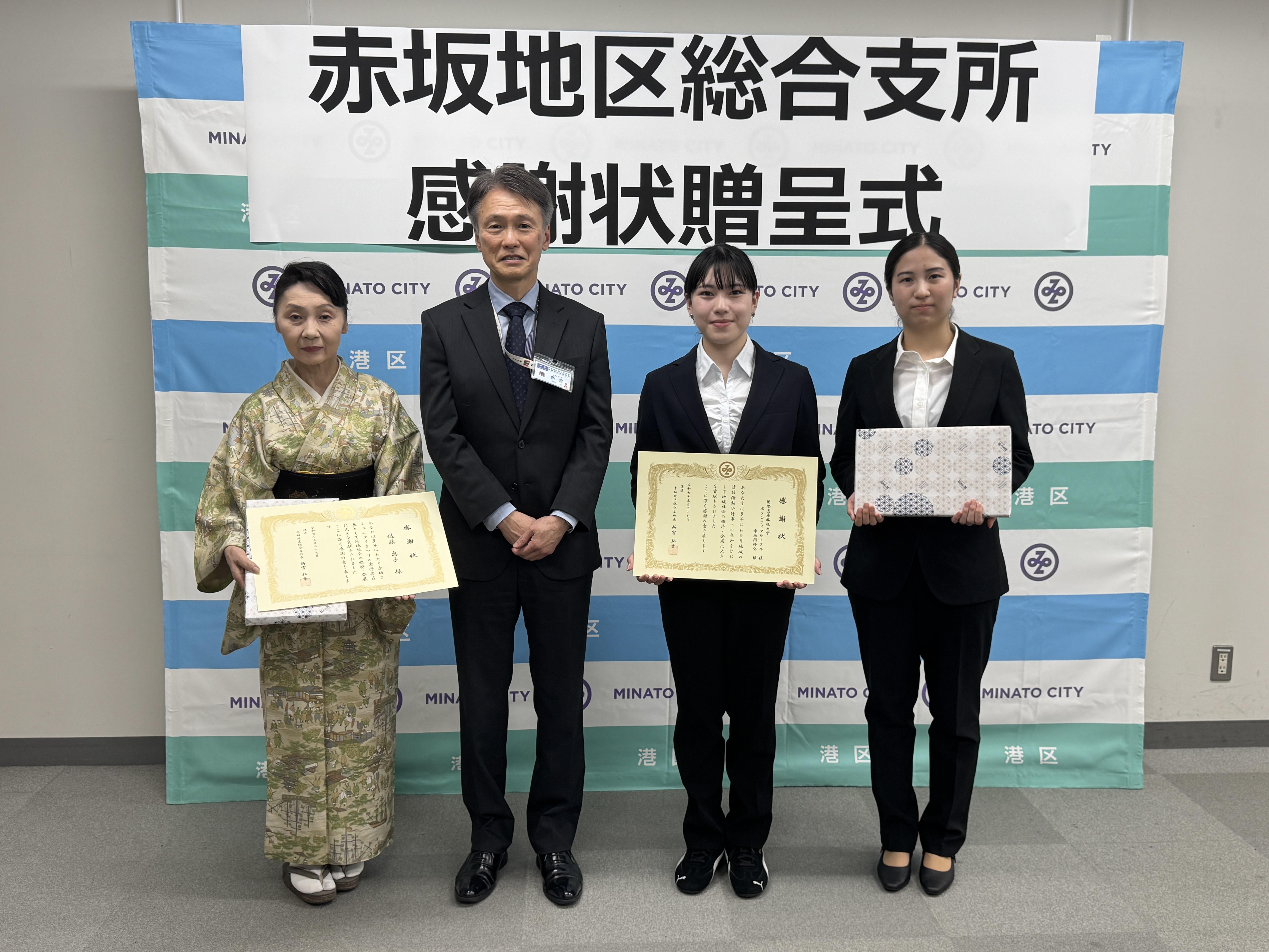ボランティアサークルと赤坂同好会が、地域活動への貢献を称えられ、赤坂地区総合支所より感謝状を贈呈されました。
