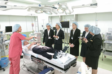 ![]() 三田病院で手術室を見学する学生たち |