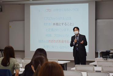 まず、中田光紀学科長より、自宅待機期間中の勉学に対して労いの言葉があり、続いて、教務担当の白井明美先生からは、学事暦や学生生活上の注意点についての説明や、その他、保護者との協力体制などについての話がありました。