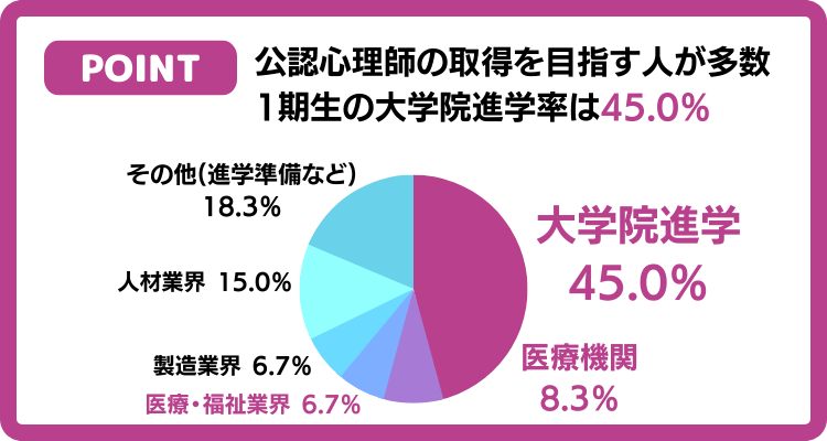 2022年3月に卒業した心理学科の第1期生は、なんと45.0%が大学院へ進学しました!